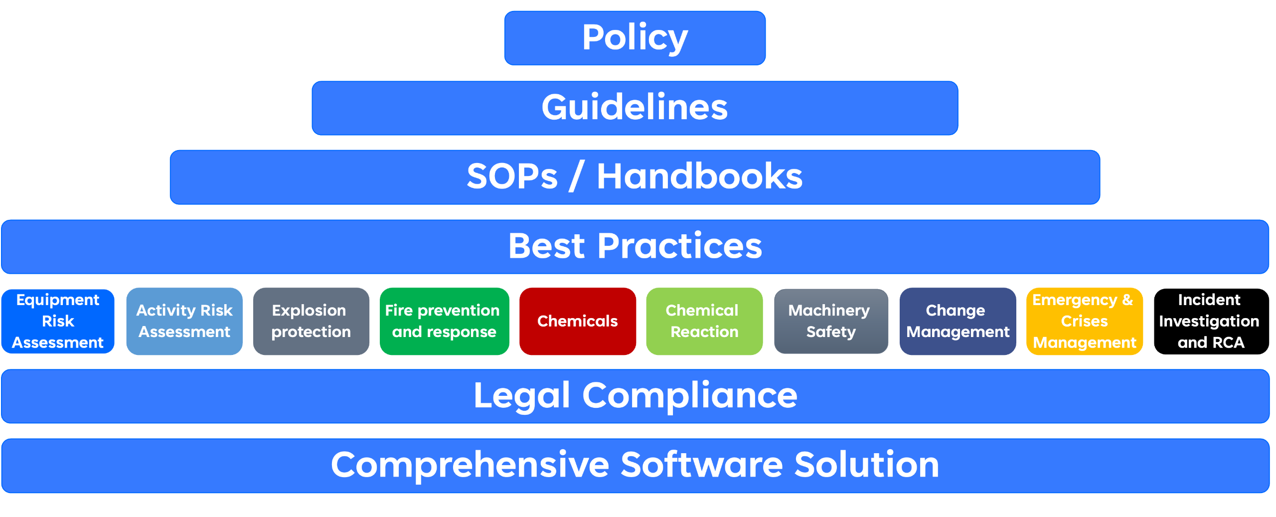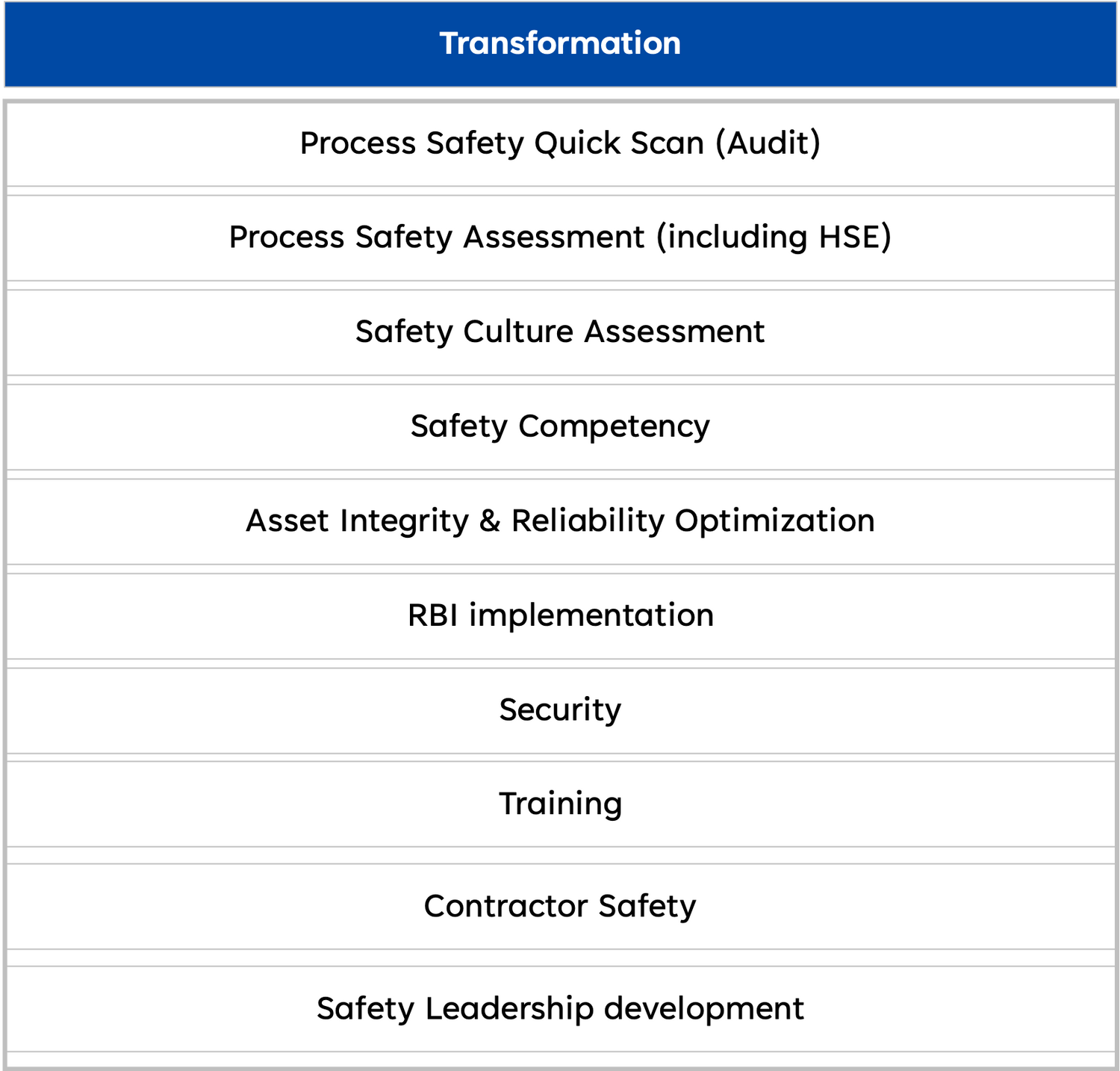 Gap identification with a quick scan (audit) or deeper assessment. Define a program to improve safety performance and setting up robust management systems (process safety, risk based inspection, contractor safety etc.).